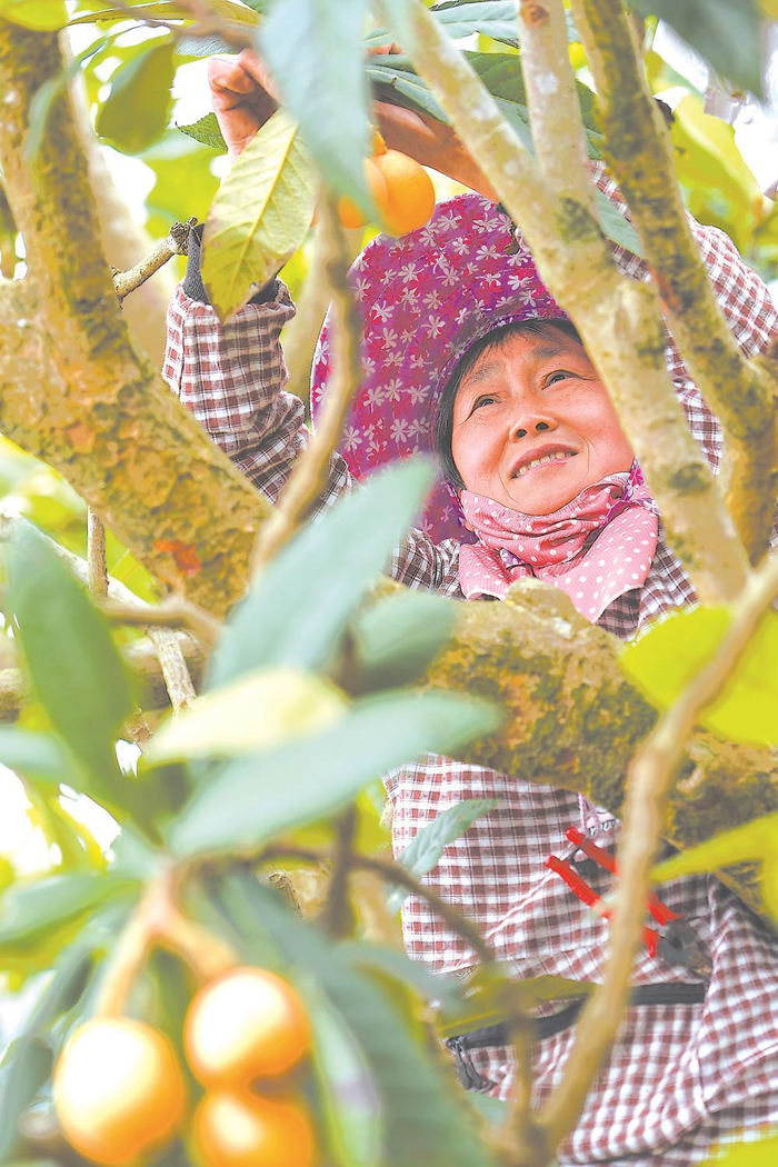 在常太镇松峰村的果园里,村民采摘成熟的枇杷。