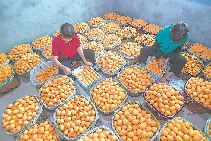 果农将刚采摘的枇杷分拣、打包。