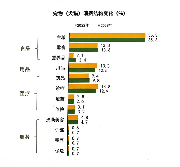 从宠物消费结构来看,刚需的宠物食品仍是宠主的主要消费市场,《白皮书》数据显示,2023年宠物食品市场份额为52.3%,占据了宠主消费的半壁江山,可见“民以食为天”在宠物界同样适用,而宠物主粮作为宠物最主要的食品,有着广阔的市场发展前景。
