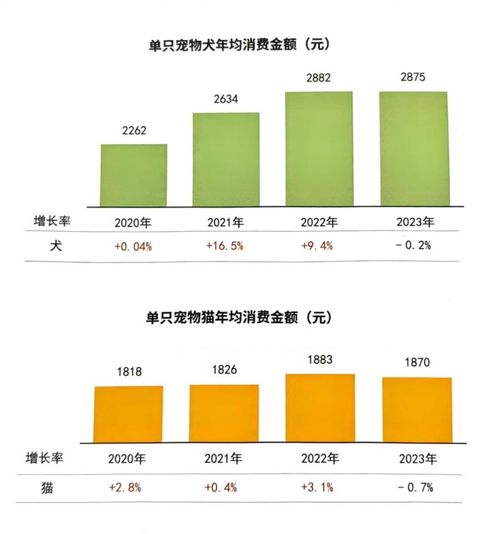 从消费金额来看,单只犬年平均消费2875元,较2022年下降0.2%;单只猫年均消费1870元,较2022年下降0.7%;对比可见,犬猫消费金额仍有较大差距。