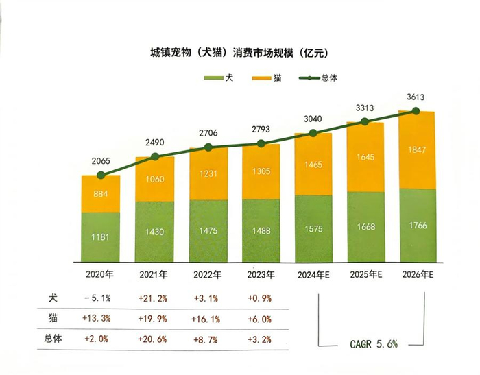 根据《白皮书》数据,2023年城镇宠物(犬猫)消费市场规模达2793亿元,较2022年增长3.2%,增速有所放缓;预计2026年城镇宠物(犬猫)消费市场规模达3613亿元。