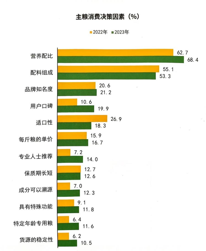 哪些因素会影响宠主对主粮的选择?根据《白皮书》数据,营养配比、配料组成和品牌知名度是宠主最关心的因素,分别占68.4%、53.3%和21.2%。同时,宠主对用户口碑的关注度大幅上升,占比为19.9%,相较上年的10.6%提升了9.3个百分点。由此可见,宠主在喂养宠物的过程中,关注的重点不仅是吃饱,更要吃得健康。