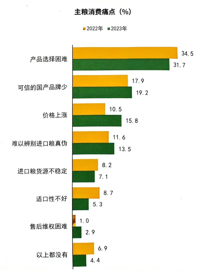 与此同时,在主粮消费中,产品选择困难仍是最大痛点,但较2023年占比有所下降,还有19.2%的宠主认为“可信的国产品牌少”,较2022年的17.9%上升1.3个百分点,并成为宠主选择主粮时的第二大痛点;而随着年龄段的增长,宠主对“可信的国产品牌少”的消费痛点逐渐下降,说明年轻宠主更青睐国产品牌。此外,宠主对价格上涨、难以分辨进口粮真伪的关注度均有所上升。