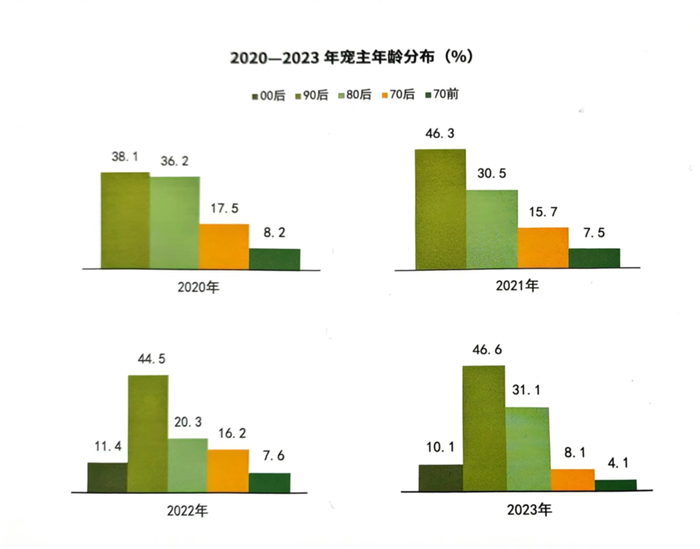 从年龄分布来看,90后宠主占比自2020年至2023年连续位列第一,2023年更是达到46.6%,占据绝对主导地位;而00后的千禧一代也逐渐进入“养宠大军”,在新增养宠人群中,00后宠主占比最高,为43.7%。