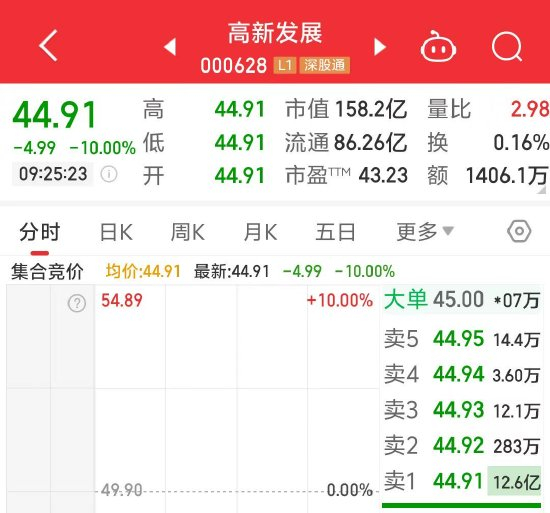 4月19日,高新发展(000628.SZ)开盘再次跌停,报44.91元,盘面上封单金额超12亿元,总市值158.2亿元。