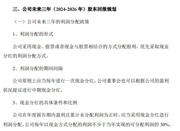高新发展发布了《未来三年(2024-2026 年)股东回报规划》,规划提出公司在年度报告期内盈利且累计未分配利润为正时,应当采用现金分红进行利润分配,公司每年以现金方式分配的利润不少于当年实现的可分配利润的30%。