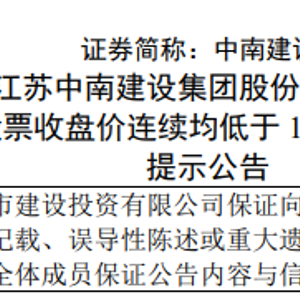 4月18日,中南建设发布关于存在可能因股票收盘价连续均低于1元/股而被终止上市的风险提示公告。