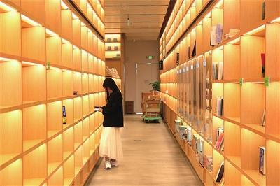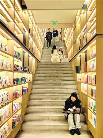 PAGEONE五道口店内的两侧书墙直抵屋顶,极具设计感的发光墙体,搭配柔和的灯光影射出的简练线条与几何形图案,冲击着人们的视觉。挑高的房顶设计,层次更加分明,原木色的书架从一楼延伸到二楼,“顶天立地”的设计看起来特别震撼。一层的左侧有一个很大的咖啡吧台,中间区域是重点产品展台和新书推荐展台,后面是文创产品专区,一层右侧的图书主要以设计、艺术、摄影类图书为主,还有很多英文原版书。阶梯样的展示墙,墙面满满当当地陈列着丰富的艺术英文画册,从一层一直延伸至二层。“东野圭吾出版了新书,我今天一有空就赶来了,想第一时间一睹新书的风采。”正在新书区翻看着《假面游戏》的小徐笑着告诉记者,她是个推理小说迷,这本书她已经期待很久了,纸质书总能带给她沉浸其中的质感。来自德国的留学生Erica则表示,她是北京语言大学大二的学生,听同学说这里有很多英文原版书,当天趁着没有课过来逛逛,“我想,以后会经常来这儿的,这里除了英文原版书,各种类型的图书都很多。我可以通过这些书,更好地了解这个世界,通过书上的文字,可以到达更多的‘远方’。”