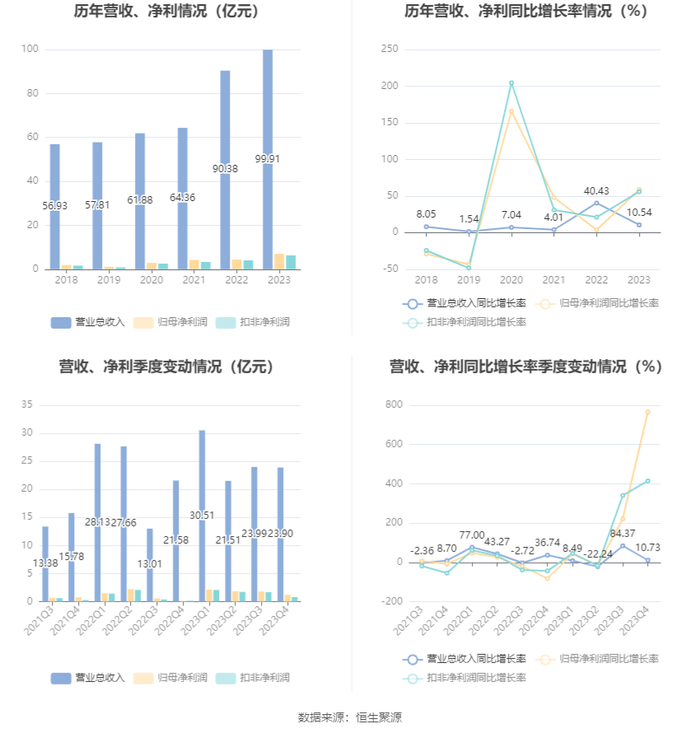2023年,公司毛利率为17.48%,同比上升3.25个百分点;净利率为7.23%,较上年同期上升2.21个百分点。从单季度指标来看,2023年第四季度公司毛利率为16.00%,同比上升6.34个百分点,环比下降3.54个百分点;净利率为5.60%,较上年同期上升4.07个百分点,较上一季度下降2.40个百分点。