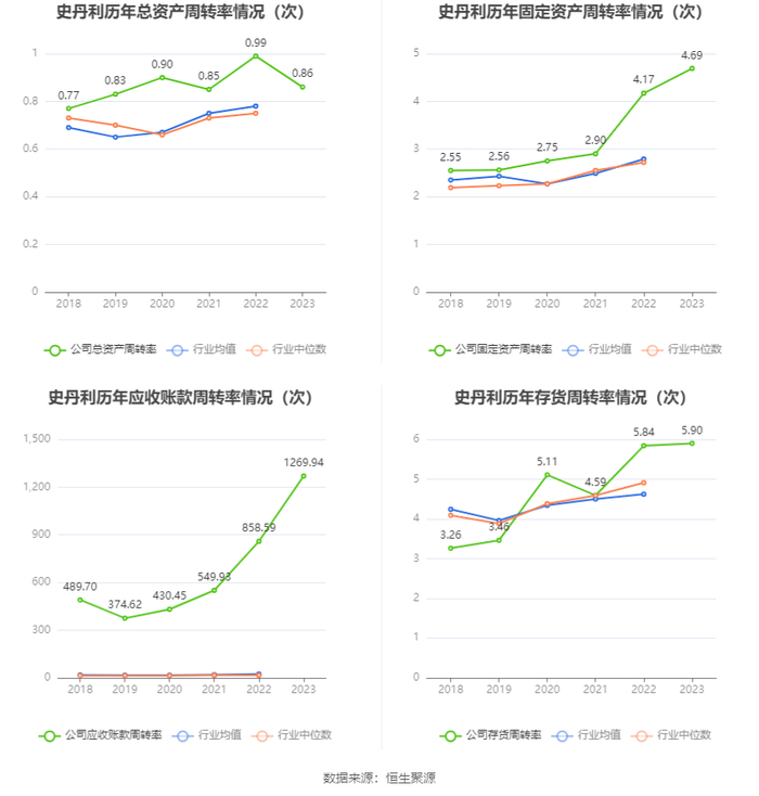 营运能力方面,2023年,公司公司总资产周转率为0.86次,上年同期为0.99次(2022年行业平均值为0.78次,公司位居同行业15/59);固定资产周转率为4.69次,上年同期为4.17次(2022年行业平均值为2.79次,公司位居同行业14/59);公司应收账款周转率、存货周转率分别为1269.94次、5.90次。