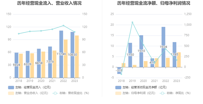2023年,公司经营活动现金流净额为11.85亿元,同比下降37.73%;筹资活动现金流净额6.73亿元,同比增加2.35亿元;投资活动现金流净额-39.79亿元,上年同期为-5228.2万元。