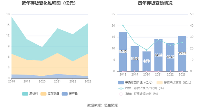 从存货变动来看,截至2023年年末,公司存货账面价值为15.53亿元,占净资产的25.38%,较上年末增加3.11亿元。其中,存货跌价准备为243.56万元,计提比例为0.16%。