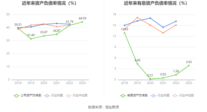 在偿债能力方面,公司2023年年末资产负债率为44.36%,相比上年末上升2.57个百分点;有息资产负债率为3.93%,相比上年末上升2.57个百分点。