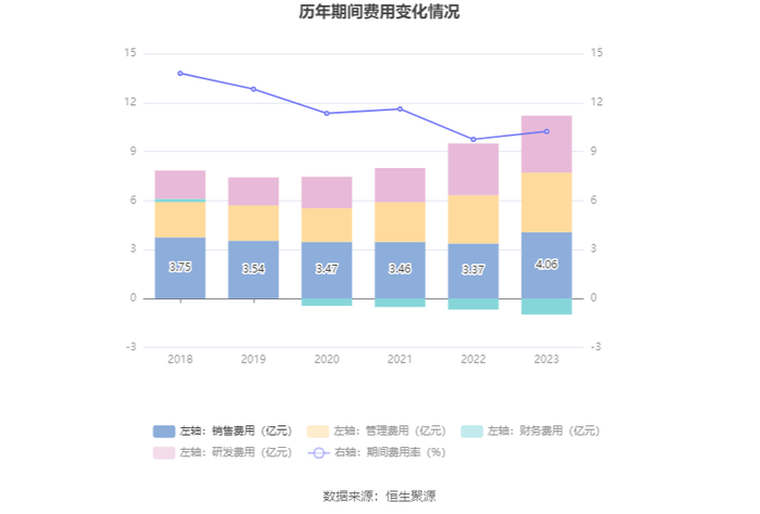 2023年,公司期间费用为10.22亿元,同比增长1.4亿元;期间费用率为10.23%,同比增长0.48个百分点。其中,销售费用同比增长20.33%,管理费用同比增长23.85%,研发费用同比增长9.82%,财务费用-9798.35万元,去年同期-6811.83万元。