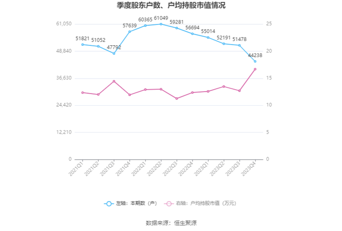 筹码集中度方面,截至2023年年末,公司股东总户数为4.42万户,较三季度末下降了7240户,降幅14.06%;户均持股市值由三季度末的12.70万元上升至16.68万元,增幅为31.34%。