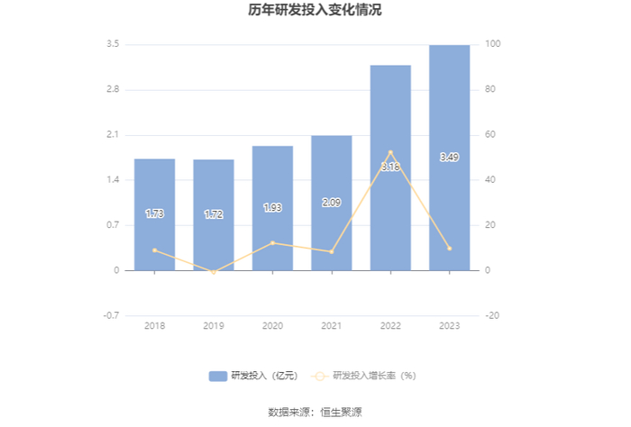 2023年全年,公司研发投入金额为3.49亿元,同比增长9.82%;研发投入占营业收入比例为3.50%,相比上年同期下降0.02个百分点。此外,公司全年研发投入资本化率为0。
