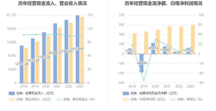 2023年,公司经营活动现金流净额为110.30亿元,同比增长188.07%;筹资活动现金流净额304.50亿元,同比增加139.30亿元;投资活动现金流净额-265.02亿元,上年同期为-114.77亿元。