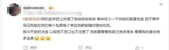 有网友看到氯雷他定上了微博热搜后,留言表示:“我的救命药上热搜了,每年吃小一千块钱的氯雷他定,药不离手。我今天突然决定,以后不忌口也不注意了,我倒要看看我的身体有多金贵。”