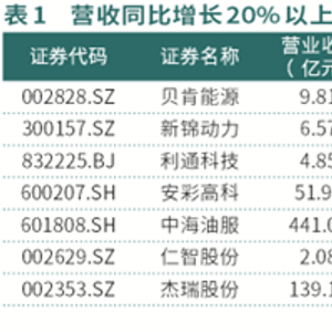 分析披露业绩快报和正式年报的29家公司,贝肯能源、新锦动力、利通科技、安彩高科等7家公司的营收增速均在20%以上(见表1),其中,贝肯能源不仅营收增速达46.61%,且归母净利润的增速也达113.55%。相比之下,营收增速同样达到40%以上的新锦动力归母净利润表现明显差很多,不仅归母净利润同比下降了61.78%,且还亏损了1.75亿元。