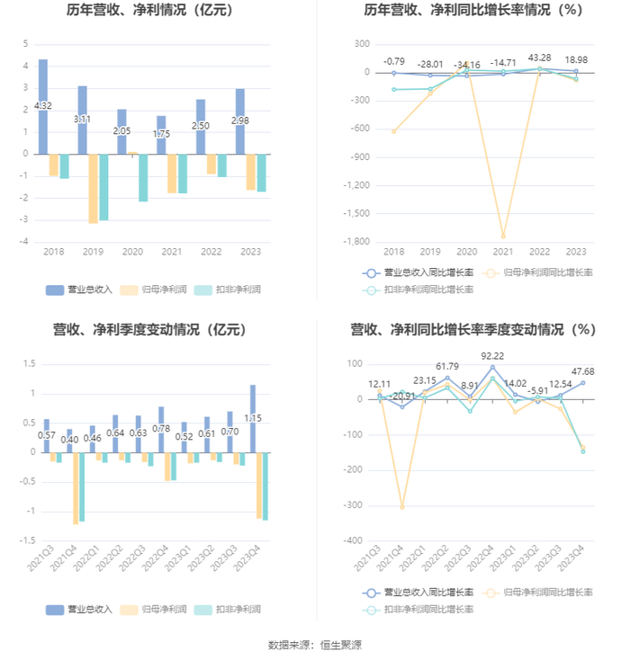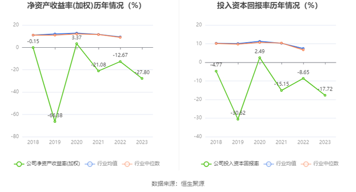 数据显示,2023年公司加权平均净资产收益率为-27.80%,较上年同期下降15.13个百分点;公司2023年投入资本回报率为-17.72%,较上年同期下降9.07个百分点。