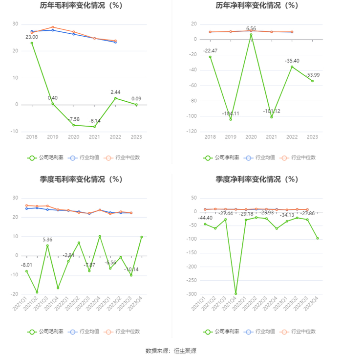 2023年,公司毛利率为0.09%,同比下降2.35个百分点;净利率为-53.99%,较上年同期下降18.59个百分点。从单季度指标来看,2023年第四季度公司毛利率为9.80%,同比下降0.36个百分点,环比上升19.94个百分点;净利率为-96.17%,较上年同期下降35.49个百分点,较上一季度下降68.31个百分点。