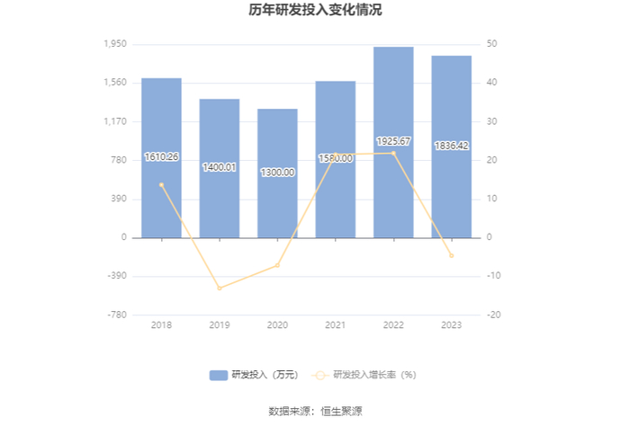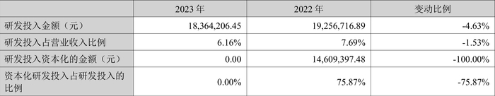 2023年全年,公司研发投入金额为1836.42万元,同比下降4.63%;研发投入占营业收入比例为6.16%,相比上年同期下降1.53个百分点。此外,公司全年研发投入资本化率为0。