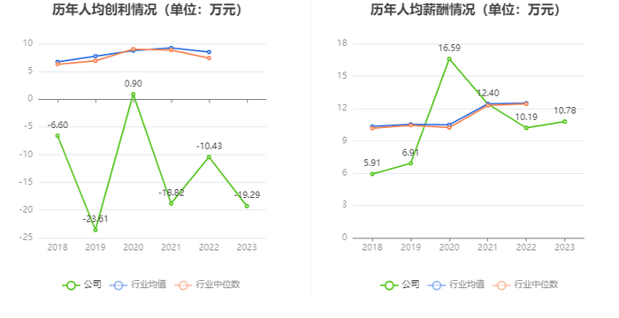 截至2023年末,公司员工总数为844人,人均创收35.30万元,人均创利-19.29万元,人均薪酬10.78万元,较上年同期分别变化21.37%、-84.87%、5.84%。