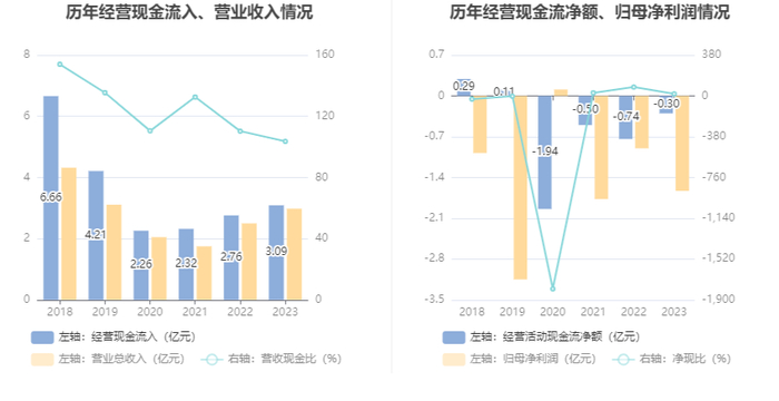 2023年,公司经营活动现金流净额为-2971.16万元,同比增加4447.81万元;筹资活动现金流净额672.57万元,同比增加3929.38万元;投资活动现金流净额-1199.64万元,上年同期为-1344.51万元。
