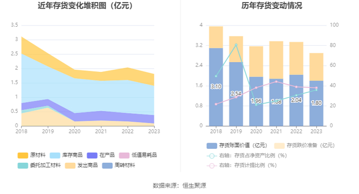 从存货变动来看,截至2023年年末,公司存货账面价值为1.8亿元,占净资产的35.84%,较上年末减少2379.08万元。其中,存货跌价准备为1.1亿元,计提比例为38.01%。