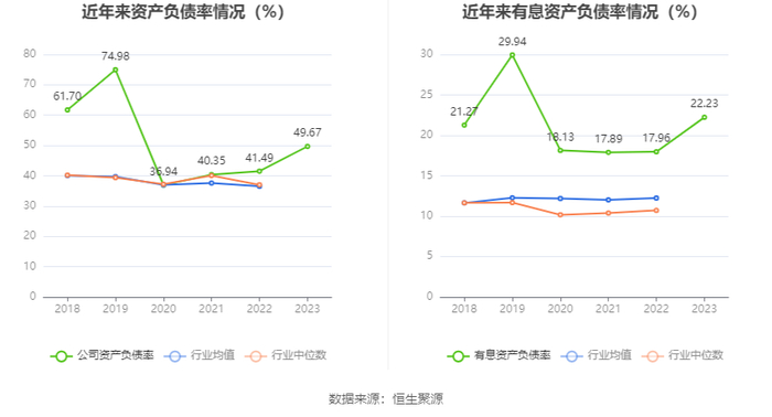 在偿债能力方面,公司2023年年末资产负债率为49.67%,相比上年末上升8.18个百分点;有息资产负债率为22.23%,相比上年末上升4.27个百分点。