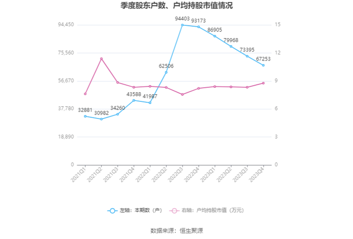 筹码集中度方面,截至2023年年末,公司股东总户数为6.73万户,较三季度末下降了6142户,降幅8.37%;户均持股市值由三季度末的8.33万元上升至8.77万元,增幅为5.28%。
