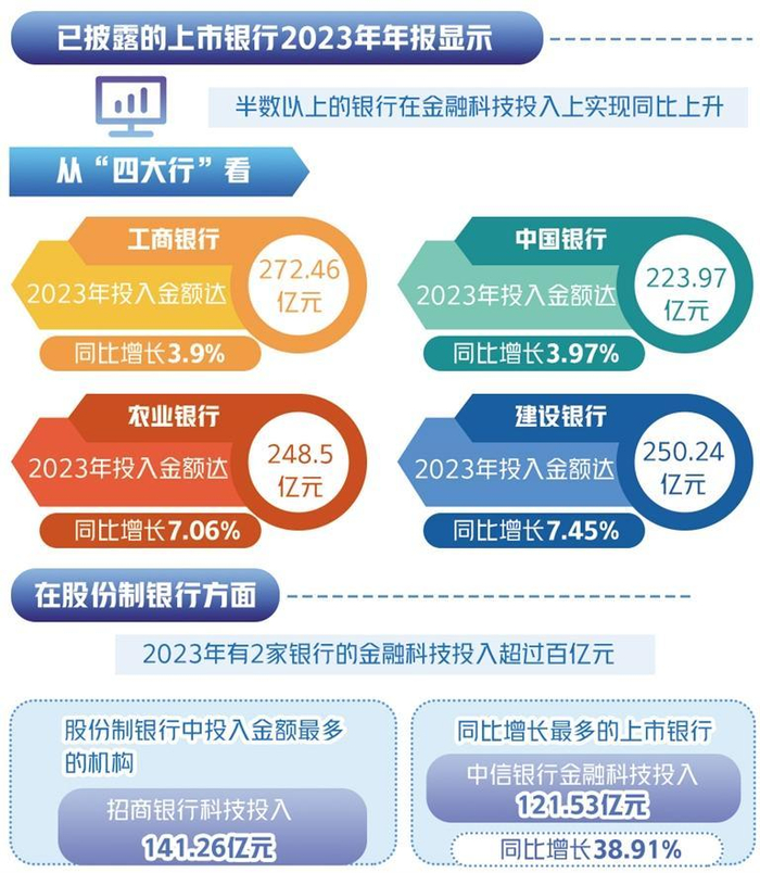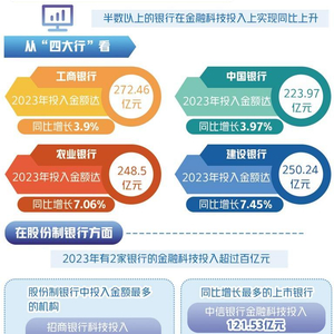 已披露的上市银行2023年年报显示,半数以上的银行在金融科技投入上实现同比上升。从“四大行”看,工商银行、农业银行、中国银行、建设银行2023年投入金额分别达272.46亿元、248.5亿元、223.97亿元和250.24亿元,同比增长3.9%、7.06%、3.97%和7.45%。