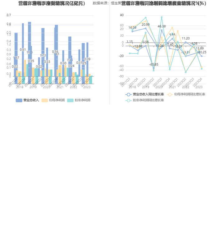 2023年,公司毛利率为48.19%,同比下降1.42个百分点;净利率为23.61%,较上年同期上升1.26个百分点。从单季度指标来看,2023年第四季度公司毛利率为52.18%,同比下降6.11个百分点,环比上升9.08个百分点;净利率为6.60%,较上年同期下降8.00个百分点,较上一季度下降19.62个百分点。