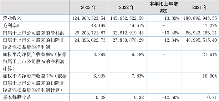 中证智能财讯 华维设计(833427)4月18日披露2023年年报。2023年,公司实现营业总收入1.25亿元,同比下降13.89%;归母净利润2920.37万元,同比下降10.45%;扣非净利润2439.60万元,同比下降12.34%;经营活动产生的现金流量净额为-5922.93万元,上年同期为392.74万元;报告期内,华维设计基本每股收益为0.28元,加权平均净资产收益率为8.29%。公司2023年年度利润分配预案为:拟向全体股东每10股派2.8元(含税)。