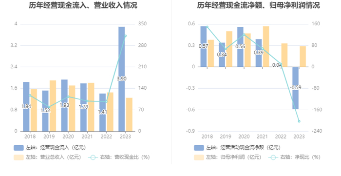 2023年,公司营业收入现金比为312.07%,净现比为-202.81%。
