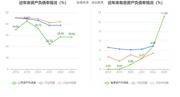 在偿债能力方面,公司2023年年末资产负债率为28.42%,相比上年末下降0.16个百分点;有息资产负债率为11.20%,相比上年末上升6.32个百分点。