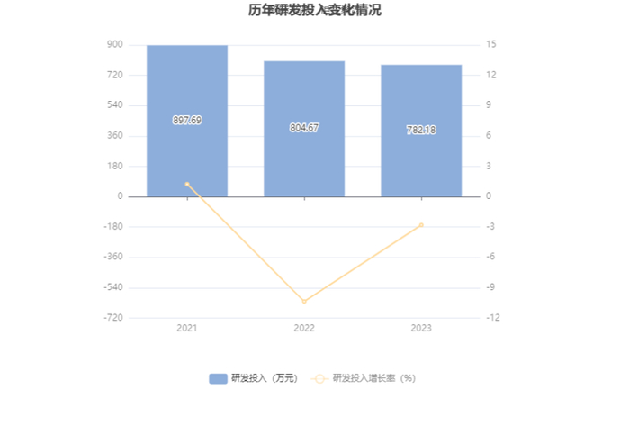 2023年全年,公司研发投入金额为782.18万元,同比下降2.80%;研发投入占营业收入比例为6.26%,相比上年同期上升0.71个百分点。