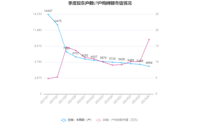 筹码集中度方面,截至2023年年末,公司股东总户数为4994户,较三季度末下降了354户,降幅6.62%;户均持股市值由三季度末的10.20万元上升至17.07万元,增幅为67.35%。
