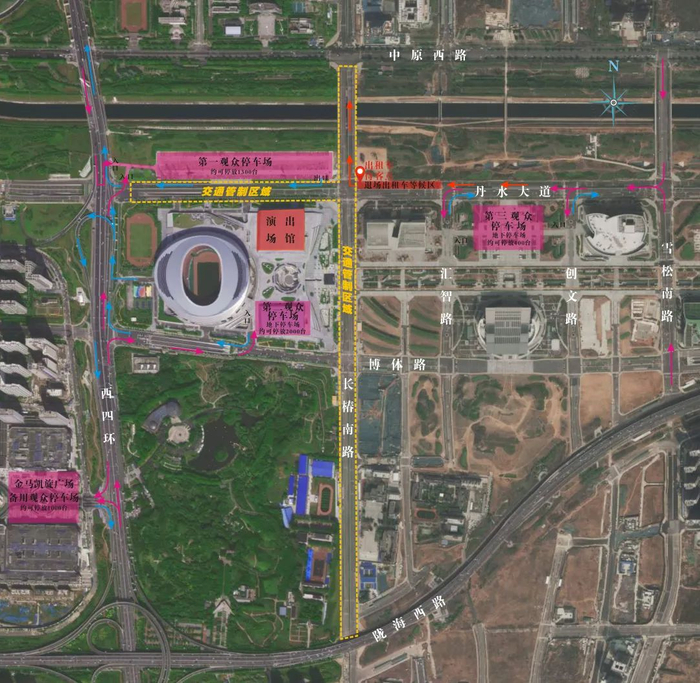 为确保观众安全、顺利进退场,防止因人车混行发生道路交通事故,4月20日(周六)16:00至22:30对长椿南路(中原西路至陇海西路段双向)、丹水大道(西四环至长椿南路段双向)实施临时交通管制,管制对象为各类机动车。