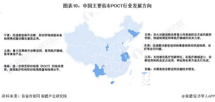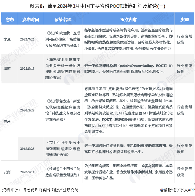 宁夏、海南、吉林、天津等地均出台POCT产品相关政策,提出加大对快速检测试剂的技术攻关力度,规范POCT的临床使用,提高医疗机构即时检测质量和检测水平。