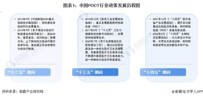 从政策历程来看,“十二五”期间,我国出台《中国制造2025重点领域技术路线图》,将快速床旁检验”列为发展重点,同时积极推进分级诊疗制度;“十三五”期间,我国出台《医药工业发展规划指南》,提出重点发展新型即时检测设备(POCT),并进一步推动分级诊疗制度建设;“十四五”期间,我国出台《“十四五”医疗装备产业发展规划》《“十四五”生物经济发展规划》,明确要大力开发即时即地检验等先进诊新技术和产品,提升即时即地检验(POCT)装备性能品质。