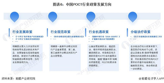 从政策类型来看,我国POCT行业相关政策主要可划分为行业发展政策、行业规范政策、行业机遇政策以及分级诊疗政策。在行业发展政策上,国家出台多项政策,如《“十四五”医疗装备产业发展规划》《“十四五”生物经济发展规划》等,明确提出要大力开发即时即地检验等先进诊新技术和产品,发展智能化现场快速检测系统、新型分子诊断系统、快速病理诊断系统等,为行业发展指明方向;在规范政策上,在新冠疫情蔓延期间,国家市场监督管理总局发布《体外诊断试剂注册与备案管理办法》,明确第一类体外诊断试剂实行产品备案管理,第二类、第三类体外诊断试剂实行产品注册管理;在行业机遇政策上,《健康中国行动(2019-2030年)》中提出十五大重要行动,其中,心脑血管疾病防治、癌症防治、慢性呼吸系统疾病防治、糖尿病防治、传染病及地方病防控是POCT行业的重要应用领域,随着“健康中国”战略的持续推进,POCT的需求将持续释放;在分级诊疗政策上,在分级诊疗的大政策背景下,基层医疗机构对于心肌、炎症以及维生素/激素等慢病管理相关的检测需求会逐渐凸显,同时基层医疗机构POCT累积的存量市场规模巨大,随着医改深化,将会得到进一步的释放。
