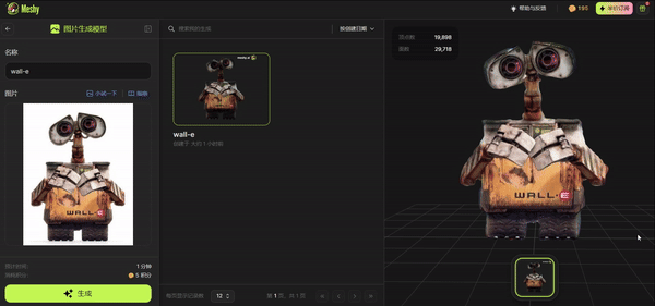 来源:Kaedim视频演示Wall-e模型,Meshy AI积分生成模型,Luma免费生成模型