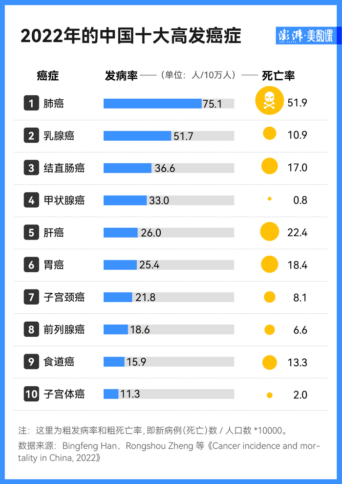 所幸的是,乳腺癌和甲状腺癌的死亡率不算很高——整个 2022 年,每 10 万名中国女性中,死于乳腺癌、甲状腺癌的人数分别为 10.9 和 1.1。早在 2010 年至 2014 年之间,中国乳腺癌患者的五年生存率已达了 83.2%。