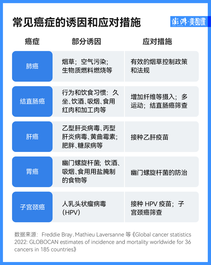 烟草、肥胖和细菌、病毒等感染,是癌症的三大风险因素。因此,控制吸烟、饮酒,增加日常锻炼控制体重,对于常见的几大癌症来说都有一定的应对作用。中国国家癌症中心也曾表示,中国居民四分之一的癌症死亡与吸烟有关。