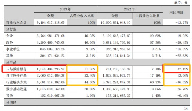 数据显示,在公司的四大主营收入中,虽然云与数据服务的收入占2023年总营业收入的11.36%,次于行业解决方案和自主软件产品的营收占比,但与上年同期相比,云与数据服务的营收同比增长最高,达37.12%。