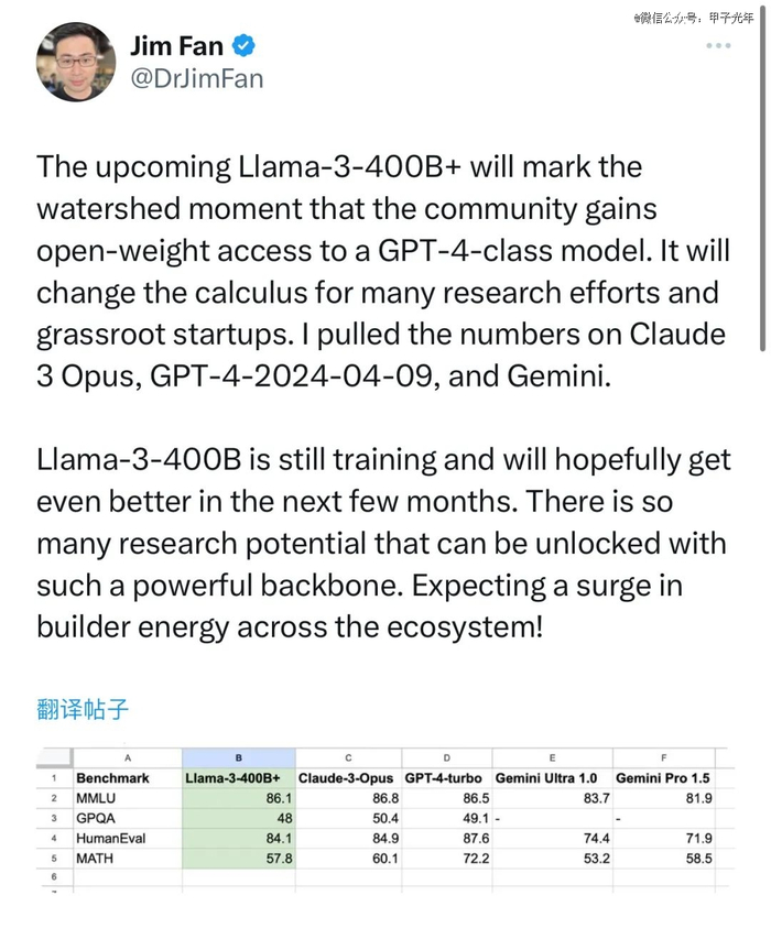 英伟达高级研究经理、具身智能负责人Jim Fan认为即将推出的Llama 3-400B+模型将是社区获得GPT-4级别模型的重要里程碑。