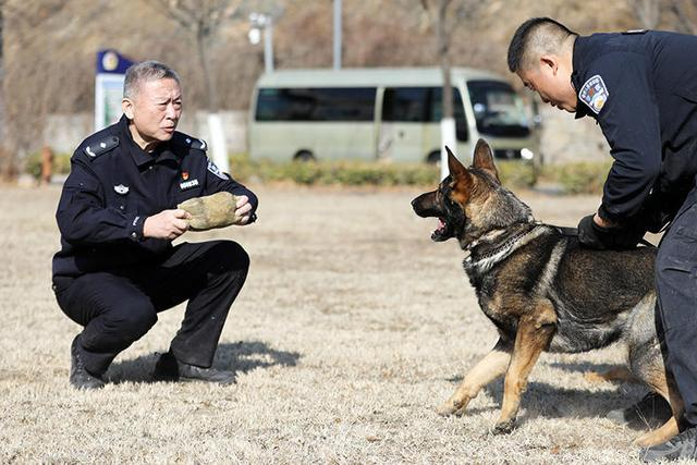 黄庆喜配合他的徒弟警犬训导员杨晓健,对德国牧羊犬进行捕猎动力训练。