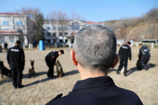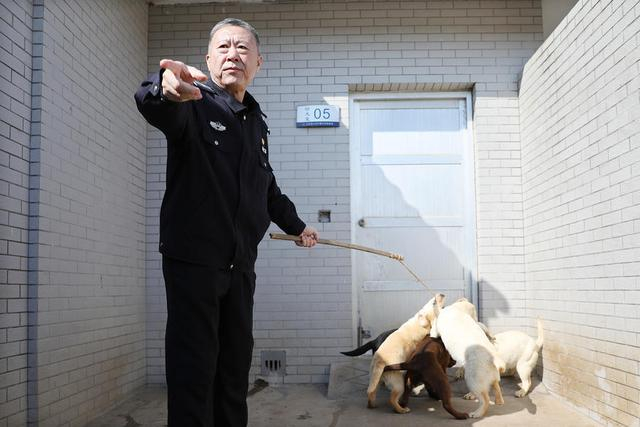 头发已经花白的黄庆喜带领年轻警犬训导员进行集体训练。