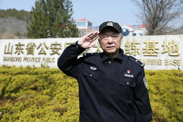 即将退休黄庆喜在山东省公安厅警犬训练基地大门前敬礼,拍照留念。